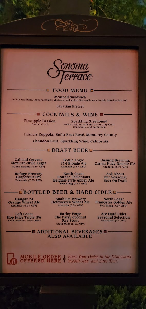 Welcome to Sonoma Terrace, nestled in the vibrant Disney California Adventure Park. This charming eatery is a perfect retreat for those seeking quality food and drink amidst the park’s excitement. The highlight of the menu features the tantalizing Bavarian Pretzel served alongside a creamy Cheese Cup, a must-try for any snacker or beer enthusiast.